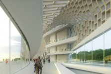 The interior of the museum combines these two different areas (exhibition and public) through a centralized entrance that separates and joins the two simultaneously, achieving a symbiotic relationship between them. Skylights flood daylight into spaces adjacent to the galleries, creating optimum viewing condition and scenic moments in and around the building.