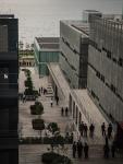 The upper floor of the social block that has the best vista of the sea is reserved for library. The middle floor of this block is designed as a living passage including small food and beverage shops, ATM units and a mid- sized coffee shop whereas the ground floor is designated as the general cafeteria for lunch meals. The main spine reaching from north to south is fragmented into smaller pieces with niches, terraces and different levels to avoid a monumental and harsh axis. The prevailing wind is tamed by the utilization of the blocks parallel to the sea, so that inner courtyards are protected from severe winds. This layout also helped to benefit from the sunlight efficiently.