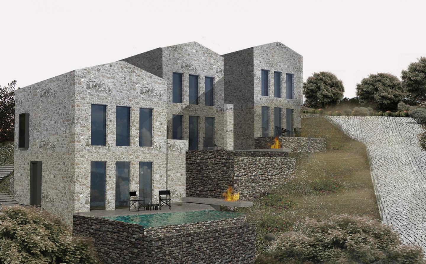 When we look at the ancient cities, architectural development, city texture of the region, we notice that there is a joint language in the material used there. While there is a dispersed system in the city settlement being lost in nature, the material are mainly natural stone and wood. In our project, the fronts of units are designed to be manufactured from Limra natural stone extracted in Kaş, retaining walls from Camyuva natural stone again from nearby areas, terraces and bearing truss from wood obtained from the registered trees of the region. Stairs to allow access in inclined areas, walking ways, terraces and landscape areas are designed with natural stone like the paths of Lycian way.
