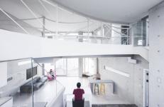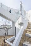Dynamic stairways are flying from 1st floor at front road up to roof garden at the top of 6th floor, strolling on various routes of this vertical town.