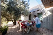 The T-House appears at home in nature. The grey of the concrete surfaces and the somber tones of timber components reflect the Mediterranean flora and the geological formations that define the surrounding landscape. The overall form is broken into small volumes so as not to present an imposing mass. Glazed surfaces define permeable openings which extend the interior spaces to the exterior with a delicate wrap-around deck serving as outdoor rooms bordered by olive trees. This effortless connection between the interior and exterior spaces is very much in keeping with the lifestyle of the owners who spend a considerable part of their day in the open air. It is also a conscious (albeit modern and more transparent) reworking of the spatial theme of hayat, which is integral to Turkish vernacular traditions and is reflected here in the plan of the house as a semi-open core for daily chores and routines.