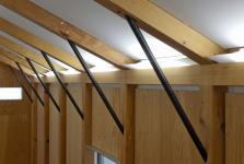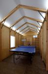 The 3hinged rahmen structural system was to meet the necessary height of the ceiling for playing ping-pong in a minimized building volume. It enables the omission of beams and keels of the wooden roof structure.