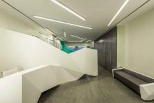 Angled in plan and in section simultaneously open work areas are encapsulated within the free flowing partitions beyond which a series of small individual cabins and a conference room are located.