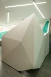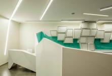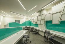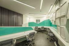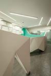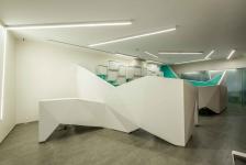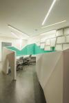 The open work areas with Corian finished stark white partitions, a graphic composition of storage modules and a bright aqua green internal finish to the partitions creates a strong composition that varies as one moves past it or within it.