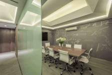 A palette of grey textures forms the floor walls and furniture of the rest of the office with a graphic composition of drawings forming the backdrop walls of the conference room.