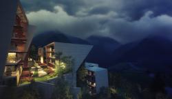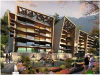 All the units designed are facing the primary view of the Himalayan mountain ranges. The plot is divided in a stepped terrain, to get an unobstructed clear view.. Orientation of all blocks is N-S, to achieve maximum light & heat throughout the day. The facade is primarily inspired from the profile of mountain ranges , hence the inclined end corners and angular balconies. The triangular cut outs are also added inspired from the same concept,thereby enhancing the dynamics of the form. A landscaped podium is created which houses parking beneath. This caters to the shortage of parking space & outdoor amenity space in Gangtok.