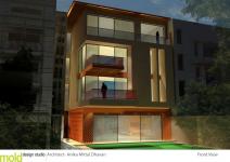 Simple and linear, the design revolves around the front garden/lawn, which is a rare urban opportunity these days in Delhi with the latest bye-laws. The entertainment activities are planned on the ground floor, around the front garden so that they could directly open out into the green space. Alternatively, an open space is provided in the center of the house to try and incorporate and bring in the greens into and within the house. The Ground floor is designed such that there is a through and through vision from the center of the house with green on either ends. The entry is designed so as to create a variety of experiences in all directions. The living spaces are divided over the first and second floors with the basement being used for informal entertainment, storage and services. The open space in the center unifies all the floors, while providing a relief space that brings in light & also an opportunity to create a sculptural element.