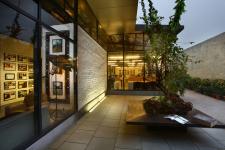 Approached from the exterior, the building unfolds in a series of planned and unplanned architectonic gestures. The front facade is virtually transparent to the eye, the emphasis being on traversing a circumambulatory path around a mostly glazed pavilion. As one rounds the corner, an intimate courtyard reveals itself to be carved out from within the rectilinear volume. Minimally adorned with a steel planter bench, one involuntarily pauses to take in the unrestricted views through the studio and into the reception, transposed against a white brick wall set within a glazed envelope delineated only by the thin members of the dark frame. Arough hewn stone wall on the right has been raised to the same height as the building, creating the appearance of a walled in court in the spirit of Luis Barragan, removing distractions and allowing contemplation of the sky and conversations with the passing clouds.
