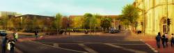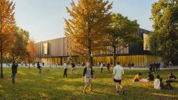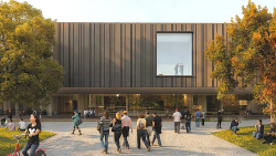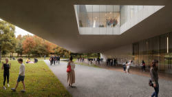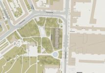 Contextually, the project addresses the park at the level of siting, program, and materiality. The ground floor level bar structure runs parallel to the eastern edge so as to relate to the Kavallierstraße on one side and on the other to create an outdoor covered terrace that addresses the park as a whole. This strategy programmatically activates the street. Two entrances, one to the Foyer and the other to the café, provide access through the otherwise solid bar. In terms of pedestrian routes the proposal maintains the two existing routes that traverse the site, only slightly modifying one of the routes but maintaining its directionality and connectivity. Additionally, the Main Entrance is located at the midpoint of Springbrunnen Fountain and the northern part of the site, coinciding with an edge of the Sports Field and the route that leads to the parking.