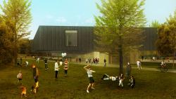 In order to satisfy the brief’s requirement of having a single open exhibition space, we opted to create a low profile horizontal building raised off the ground level, a distinct object yet fused with the landscape. This strategy not only resolves programmatic issues but contextually allows the building to camouflage itself within the park trees. The ground floor is understood as an extension of the park, where the floating volume allows for park activity and public functions of the museum to blend with each other. Additionally, the project is inspired by two Bauhaus elements. The volume is based on a floating table located in the Staff Room of the Engineering School and the roof is an interpretation of a Herbert Bayer’s Bauhaus-Alisstellung poster of 1923.