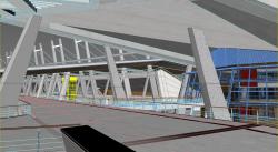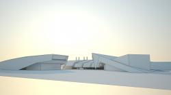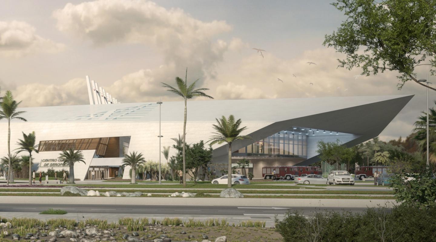 The firefighters headquarters, the sports administration and the stand buildings shape have been materialized as a very clear, clean and tensioned silhouette to be constructed as phase one. The white horizontal lines of the grades and the curve of the grades roof contrast with the vertical sun protection wooden blinds of the Indoor Arena of phase 2, and with the faceted white concrete block elevations of the Aquatics Stadium for the 3rd construction phase. Between them, a multipurpose open air plaza and fountains join the buildings with the parking areas and the rest of the sports fields.