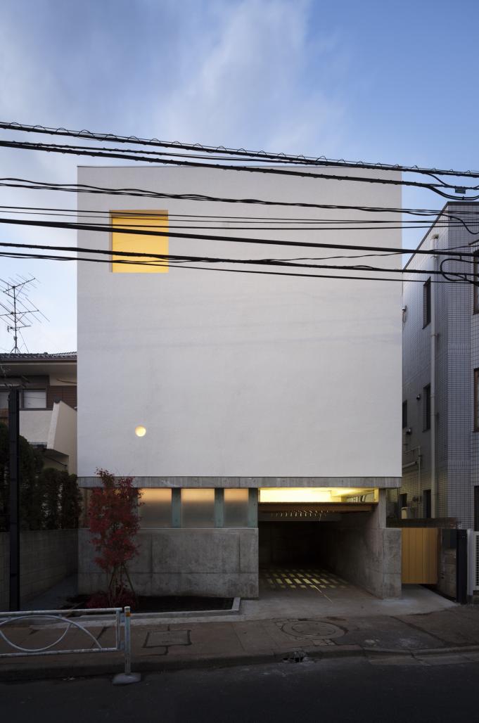 The site is in a densely residential area in Tokyo. Walls of neighboring houses and bunches of cables between electric and telephone poles block the vista from the house.