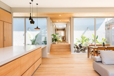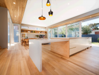 Mixed of recycled and Tasmanian Oak timber flooring from plantation was laid in the old and new extension. All timber flooring and veneer cupboards were sealed with Wocca natural oil free from any VOC. All masonry walls were constructed from the salvaged on site bricks.