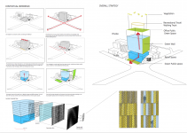 The building envelope also considers environmental aspects such as solar gains as well as Comfort issues such as glare. The building open on three sides has different and specific solar loads in accordance to orientation. In order to combat this issue the louvered facade which has the ability to completely close and open is perforated using a differentiated pattern created using parametric design tools which will reduce overall heat gains on the interior of the building whilst allowing for ample daylight to penetrate the floor plates reducing the need for electromechanical lighting and cooling . The intelligence skin therefore allows the building to build on a long history of sustainable design within Iran and create a building which will have a reduced Energy footprint