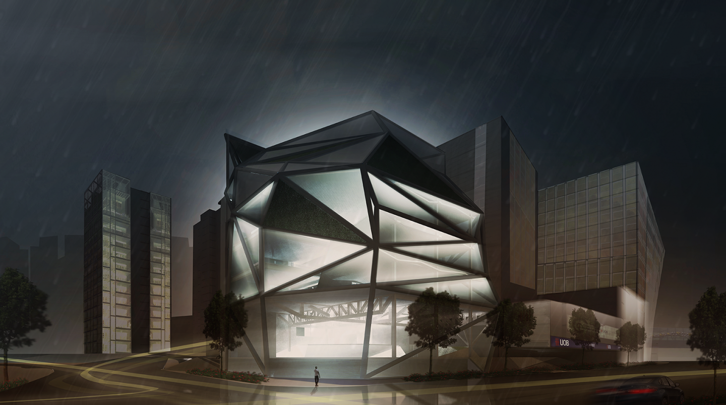 The idea is to be the beacon, an anchor point in orchard road. A haven for the crafts and specialized goods within the busy streets of commercialism. Its form is derived from a mathematical algorithm called the Delaunay triangulation. Palladium, the chemical element of atomic number 46, a rare silvery-white metal resembling platinum, also has another meaning; a safeguard or source of protection. Therefore the design centre is one of a kind in form, function and meaning. It houses artisans and their work, as well as promote the craftsmanship skill in the bustling city of Singapore where almost everything has lost its uniqueness to the growing manufacturing world we live in.