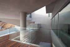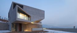 Sitting at the top of a hill, the project was designed to architecturally counter the severe on-site weather conditions by adopting a series of outer spaces in the form of inner courts. Contrary to more commonly seen outdoor spaces (madang: a kind of traditional Korean forecourt) in local houses, the project adopts a fortified structure surrounded by a spiraling sequence of spaces. The inner courts emerging at each floor inspire a variety of personalized activities, including leisure, play and exercise, corresponding with the needs of the residents; the second floor is reserved for the grandparents and children, and the third floor uniquely for the couple. Connected by rooms, stairs and decks, the spiraling sequence enables communication between spaces. Set at differing angles, the courts are also intended as observation points; each facet faces outward responding to the scenes of daily and seasonal change captured on the surrounding hills. The sculpted multi-faceted mass of Shincheon-ri House conceives a vacant core of inner courts, generated from the conditions of nature and of family culture.