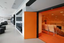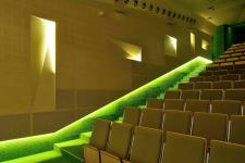 The primary objective of the project was to create comfortable and modern interiors adequate for giving lectures. A auditorium is the largest (for 220 people) and a multi-functional one. Two others (B and C) can comprise 160 people. All three auditoriums are of similar décor but with individual interior design and differentiated by color of the interior - the colour code implied in the project is its key idea and it helps to identify the halls. Modernized lecture halls are equipped with complete electronic installations and advanced multimedia systems including simultaneous interpretation system. The project includes also a design of service rooms – foyer of auditorium and a “history of computer technology room” which complements educational functions of auditoriums. The service rooms, in contrast to the lecture halls, are designed in white colour which intensifies the effect of "immersion" of the user in "the space of color" after entering the auditoriums.