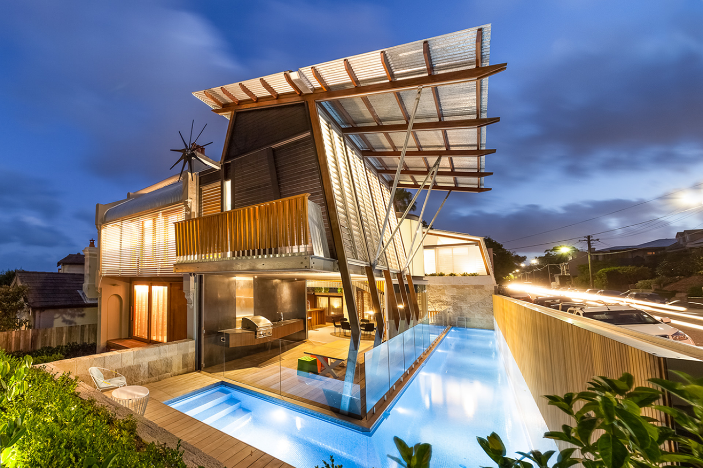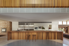 The project is located on the east coast of Australia near the beaches of Sydney. Designed for a young family with four children under the age of 6 the planning was generated by a need for growth, flexibility, diversity and the evolution of spatial function over time. The communal areas are all connected through non-restrictive pathways with visual connections between each space and each level achieved through internal courtyards and open, yet spatially and materially defined planning. The swimming pool is designed to reflect and refract sunlight into adjacent living spaces and cool warm summer breezes whilst creating an internal outlook in the evening. The dining room acts as the heart of the home with panoramic outlook to the swimming pool. The desire for the occupants to dine at a round table drove the form of the dining space and the stair configuration which accentuates the circular form and provides a dramatic circulation path through the home. The non-architectural costume of the round table also inspired the anti-conceptual decision to make each part of the home as uniquely important as the next. A complex range of rich spatial qualities is explored; from refuge and cave-like spaces through to elevated tree house-like spaces. A high priority is placed on sustainability in terms of both the embodied energy of the project with re-use of stone, brick and timber from the demolition of the original structure in the new works, to the minimal running costs of the project achieved with a photo-voltaic system, rainwater storage and a wind powered generator. Throughout the project there are materially dramatic transitions between multiple indoor and outdoor spaces as a response to prevailing and local breezes and the movement of the sun throughout the day and the seasons. The project seeks to heighten the living experience for the occupants whilst reducing running costs with natural light serving a dual role to achieve both thermal performance and spatial experience.