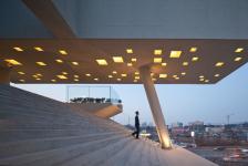 There is none of the transcendental status enjoyed by stairs at the ziggurats of the past or the stairs of Severus. Visitors will perceive steps according to their own highly personal memories. The stairs at F.S.ONE sit atop a high podium, like a huge camera, taking urban scenes into their viewfinder, and building various scenes composed of themselves. There are podiums of different heights. Most podiums provide room to sit down, but the one located between the third and fourth floors is installed only for climbing. Perhaps the Babylonians, too, who admired transcendental beings, found healing from the pain of life in such spaces and stairs that touch the sky; in ascending. The podium below the pilotis harvests urban views by gazing onto steep stairs like a rice farmer in a furrow-lined paddy. This staircase-seat soars up like eroded rock, offering visitors an abrasive welcome. The highest level is for the owner of the building. This space peels away from the staircases and podiums. Held aloft by the pilotis, the mass provides shade for those enjoying outdoor stairs, like the guardian tree in a village, blocking the snow and rain.