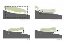The house is intended for two generations. To ensure each of them a certain amount of privacy the house is designed in the shape of the letter L - each arm for one family. Grandparents, as more traditional own a single-storey wing set in parallel to the vials. The wing is the part the house that is most strongly connected to the ground. "The young", more hungry for thrills and fond of "swinging in the clouds", received in turn the arm perpendicular to the slope, partially levitating - in the form of overhanging ledge.