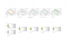 Green showers invigorate(s) the city centre of Hamburg by creating new homes and nature not only for residents but also for the entire Hamburg community. The project is developed from two major concepts: urban interior and vertical village. Urban interior is a green garden, in which the community of Hamburg gets architecturally and spatially relieved from the daily urban life. The architecture frames the garden and is read as a thick wall, on which green garden grows vertically and creates a unique experience of a green interior space shined from the sky above. The oblique cuts at each outer corner of the wall (architecture) architecturally invite neighborhood into the urban interior space. Each floor of vertical structure has various residential types and sharable communal spaces adjacent to the circulation core, encouraging social interaction between different age groups. Six-stories of mixed residential units with semi-public rooftop space architecturally define the concept of vertical village. Layers of glazing system with different finish, transparency and reflectivity are carefully applied to reveal public interaction while providing privacy for residence. Every floor is environmentally controlled by double skin on one end and vegetation on the other end. Urban interior and vertical village together create an unprecedented space where green showers.