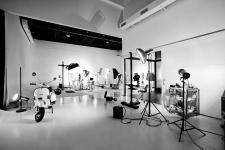 The old facade is transformed only by painting. The ramp and the rolling shutter at the existing entry are kept for taking big equipment in for big scale photography. A new entrance door is added at the new reception area which was created at the right side. 2 additional storeys are composed at the entrance side where the offices and post production units are placed. At the back side the full ceiling height is used to place the two studios.