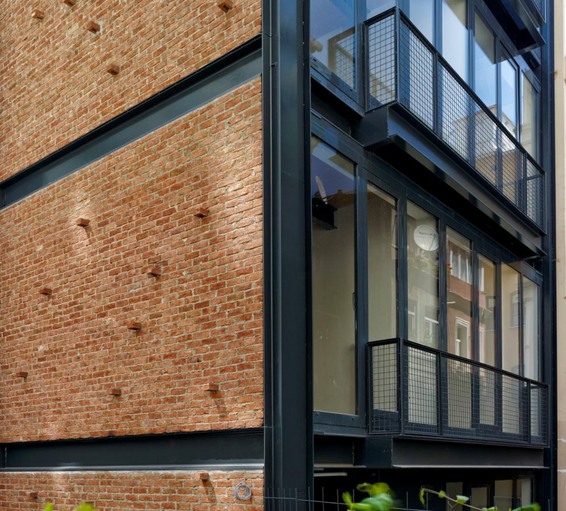 The building is adjacent to next building on one side, and the facade on other side must be a blind wall as well, according to regulations. This blind facade is composed of steel structure with insulation materials in between, and brick walls on both sides. Custom made bricks are designed to be placed uneven on facade in a natural pattern, giving different linear shades at different times of the day, breaking the monotony. These juts are also functioning as roosts for birds.
