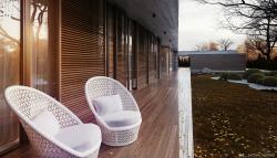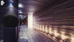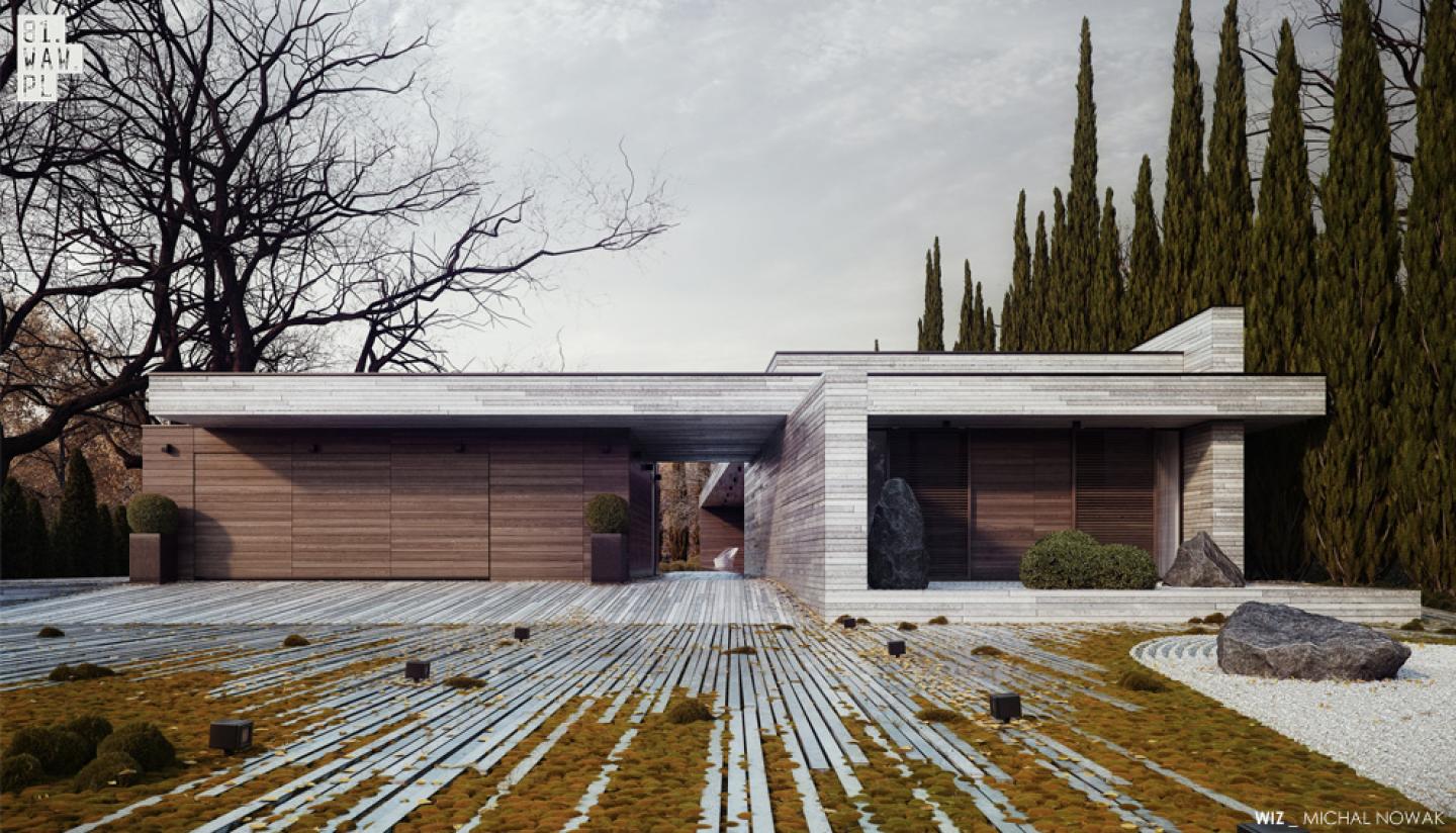 A Japan style garden was designed as a part of the whole project. The main decoration element in that garden are flat boulders and short evergreen plants. Paths made from tiny pebbles complete the whole arrangement. Wood and slat of natural stones are façade materials used to finish construction and make this building look like a block rising from the garden, and being its natural part