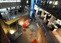 The main studio space takes the north face, and is an economical r.c.c. framed structure wrapped in glass.Architecture is brown, Interiors is orange, Electrical is yellow, Plumbings in blue and Finance is red. The external façade is transparent and houses every department’s files, documents, physical models and material samples, creating a dynamic visual collage of materials and colours that is able to represent life at Archohm, inside out! Large circular cutouts connect the floors vertically. Staggered in location, these openings visually connect across three levels. To add vitality, each cutout is equipped with its own highlight. From poles to slides, the features are varied, add energy and are quite well-used!
