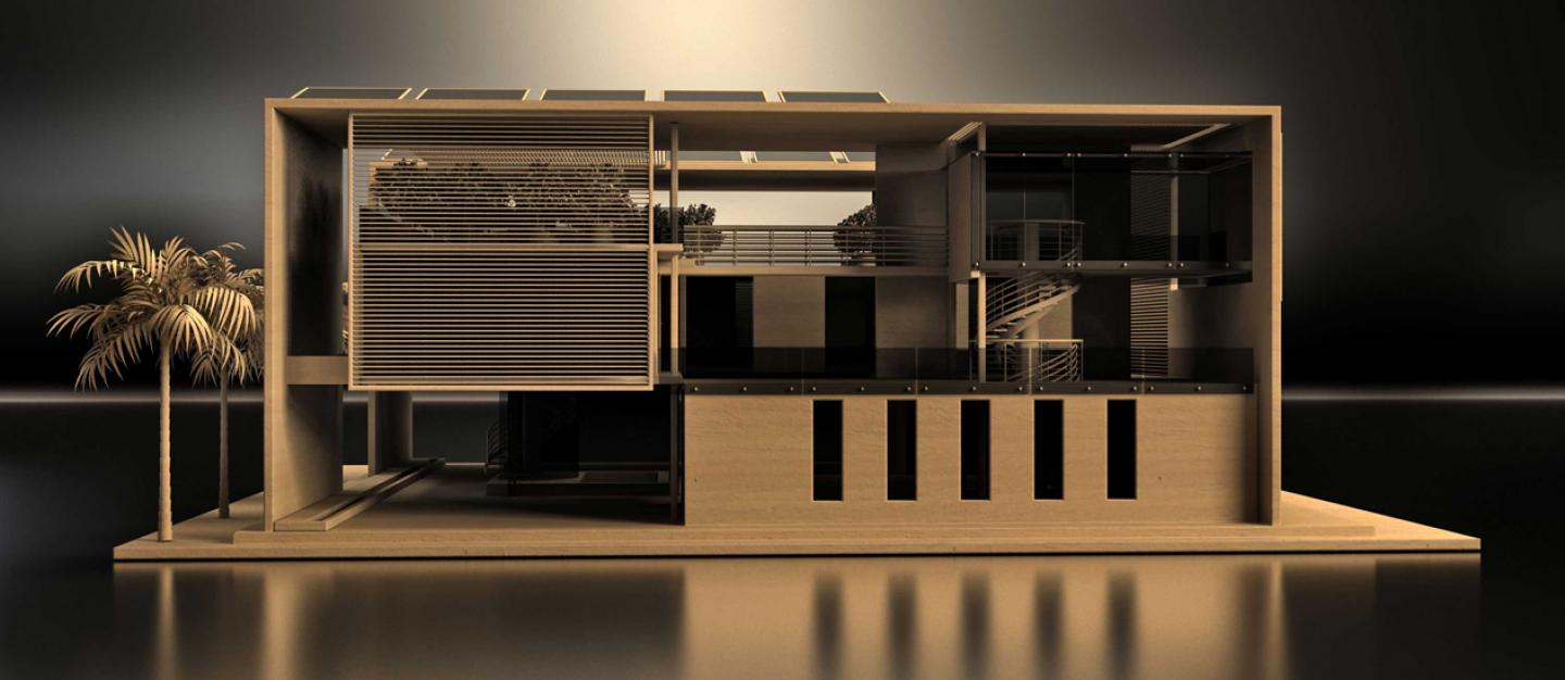 • Reducing the Carbon emissions was intended to be achieved through reducing energy needs consumed by AC by increasing the shaded areas in the building as discussed before in this report, the house facade is designed to minimize the areas exposed to direct sunlight by creating voids throughout the whole mass and using aluminum shading screens on exposed areas. In the addition to creating cross ventilation wind paths through the building masses as a strategy to decrease the thermal impact of sun heat.