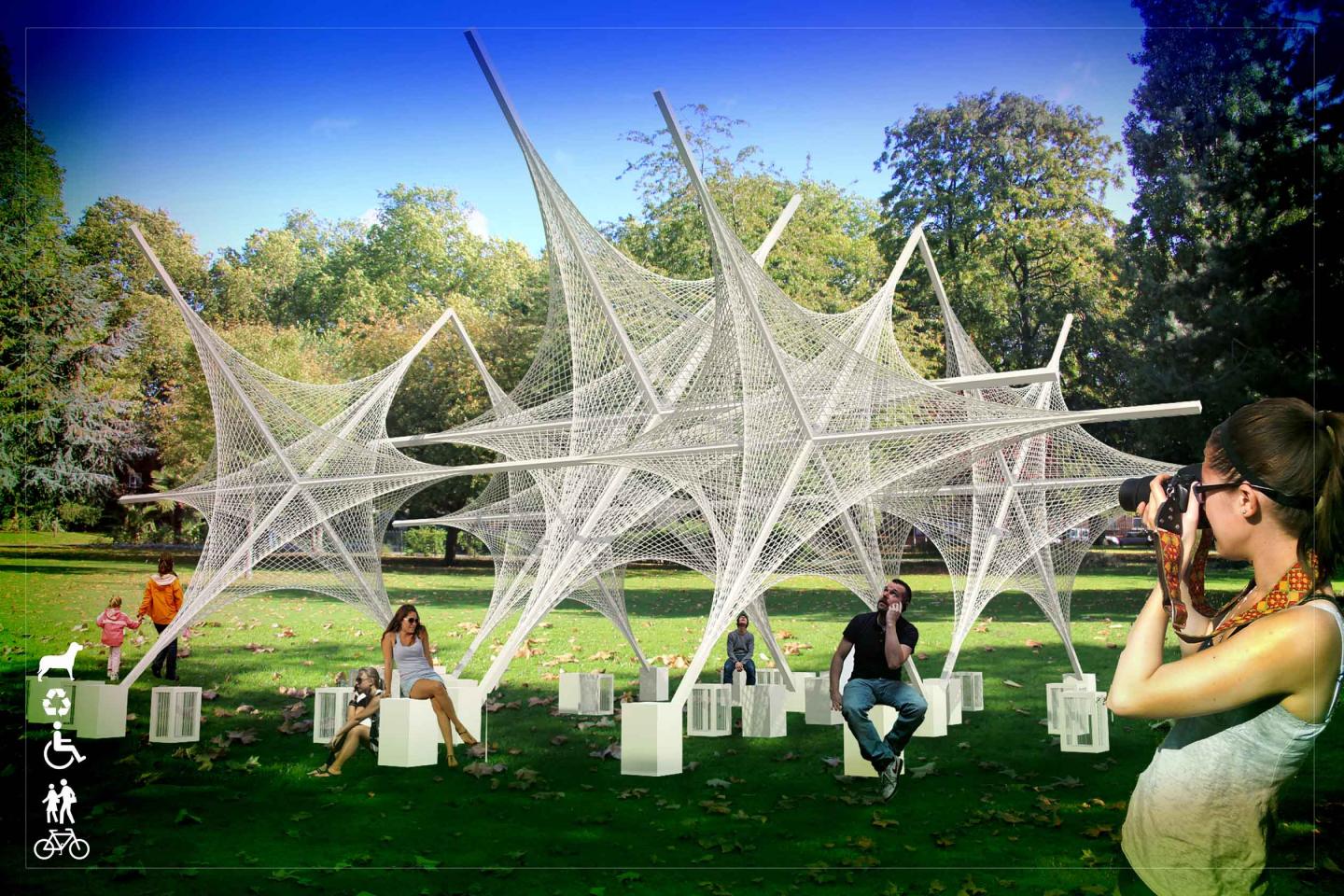 The Stars pavilion brings joy with a strong thematic concept – the shining starts in the sky. Our powerful concept enables us to design a simple, flexible and beautiful freestanding temporary pavilion. The pavilion encourages people to participate in a space of relaxation, discussion, socialization, escape, and enjoyment. Visitors can sit, move and circulate while experiencing the feeling of visual porosity and filtered light, bringing the sky and trees of the setting into the space; this effect is achieved through the use of rope strands as the pavilion enclosure. Seating boxes and recycling containers designed to complement the structure and form a relationship between the ground and the pavilion space also provide opportunities for children to learn about recycling. The structure sits lightly on the ground, anchored at points and causing minimal disturbance to the ground plane.