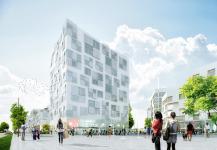 The volume of the block was sculpted into tiers to provide a maximum area of façades facing due South and to keep two finely-proportioned ground-level gardens in the block, one facing South towards the tramway and the other facing North towards the pedestrian route. These two gardens are connected together on the ground floor level to maintain North-South continuity of pedestrian routes, by a double-height covered space that extends the height of the building’s plinth. The massing of the buildings rises in a crescendo, from five storeys to nine storeys on the central esplanade. This gradual progression frees accessible terraces which are largely planted to optimise visual and thermal comfort and the management of rainwater. Large square modules of white screen-printed glass in different proportions act as “silk squares” (i.e., alluding to the name of the site and the project, Carrés de soie). To accentuate the aimed effect of lightness, but also to give more dynamics and relief to the façades, we arranged “glass squares” on two different planes in relation to the plane of the façade, which amounts to spacing them slightly apart to also allow the passage of air. The constellation of bright, shining squares enlivens the façades while acting as a protective double skin placed in front of the glazed openers of the office windows, in harmony with the light colour of the coating of the unglazed parts.