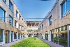 The Docks school in Saint Ouen is in a strategic urban location, in the middle of an urban complex composed mainly of high-rise office blocks and housing. The scheme is in the form of a mass built in stepped tiers on the east, on the main street, which is extended by large canopies and which folds in crosswise strips on the site’s diagonal to face southwards. These stepped crosswise strips are separated by internal gardens which open wide east-west transparent views into the school while allowing clear identification of the various teaching areas open to the light and to the peace and quiet on sheltered internal patios. Facing southwards, the school is arranged in a succession of gardens and volumes in brightly-lit terraces which gradually descend to free the view and to let in maximum sunshine.
