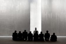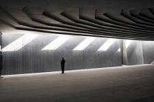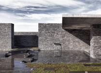 The project site is located in a prairie landscape that is separated from the surrounding suburban gated communities by a busy street. The only visible elements of the mosque are the courtyard surrounded by horizontal walls and a vertical prismatic mass of stone (minaret), which depicts that this is a “place” and the inscription signifies that this is a place for praying. The cascades following the natural slope turns into steps as one moves through the landscape, down the hill and leads to the entrance at the lower courtyard. The tea house, communal space and the library just across the mosque enriches the gathering feature of this open space. The prayer hall reached directly, a simple cave like space, becomes a dramatic and awe inspiring place to pray and be alone with God. The interior is simple where materials put forward themselves as they are, free from redundancies. The walls and the ceiling strengthen the feeling of purification and humbleness. The space may be defined as a meditation space. The only ornament is the daylight that leaks on the Qiblah wall, changing according to the time of the day. The slits and fractures along this wall enhances the directionality of the prayer space. A very special element is the letter “waw” on the reflective black wall of infinity. First time in mosque architecture, women have the chance to pray just in the same row as the men, contrary to being at the back as in all others. They are placed at an elevated and separated part of the hall. The complex includes the ablution halls, restrooms and the imam’s house from where he can reach the hall directly.