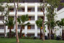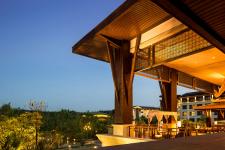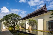 There is a constant dialog with the local vernacular architecture and it is best seen in the hotels upper floors and roofs that merge the local materials, roof tiers, along with outward slanted walls and posts for a locally inspired design. The architecture of the guestroom wings is more contemporary but still presents a relaxed attitude about it. It is this blend of soft contemporary and local architecture that exemplifies the success of the resort. Public areas that speak to the vernacularism of the region and guestroom wings that blend a more modern take on resort hotels and the traditional architecture language of Dai region.