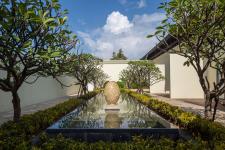 Each room enjoys a view of the inner garden and guests can enjoy the natural setting from the balcony that connects the outside with the inside. The outside, the resort’s inner garden, magically complements the architecture. This inner sanctum of the resort is an area with reflecting pools, meandering paths, and secret gardens that are sheltered by large tropical palm trees and lavish local flora. These gardens and courtyards provide spaces for recreation, gathering, meditation, or exploration. There are three pools that speak to the wide range of guests, providing areas for family enjoyment, and areas for rest and seclusion.