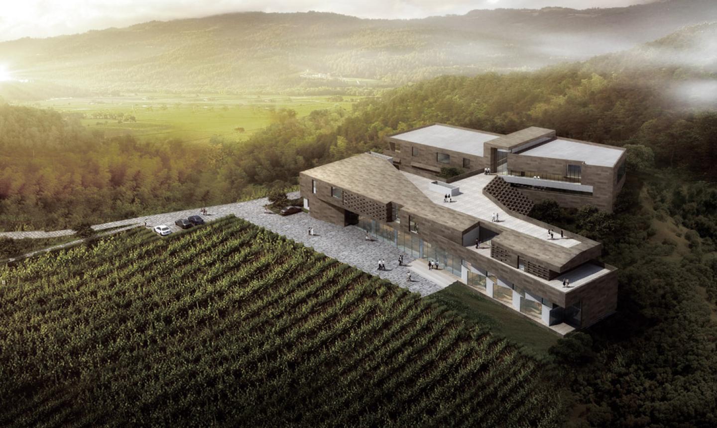 Winery was separated into two parts, one includes hotel, restaurant, and exhibition; another sits on higher level includes cellars and fermentation; a degustation hall connects two parts.