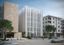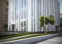Commercial multi-story office building with transparent and semi-transparent skin, changing between day time and night time, giving the building a new character with every hour of the day.