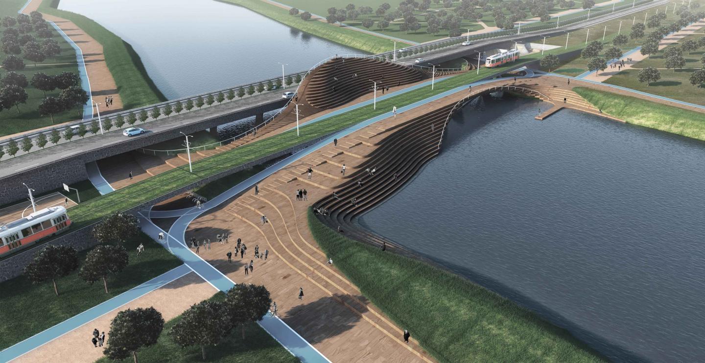 We are slowly going up to the bridge as a pedestrian so it becomes almost impossible to perceive the destination at first glance. So we have the ability to observe the surroundings from different levels. When at the very top level of the bridge (+4,50), we are suddenly facing a different world and this world allows us to experience 3 different things at the same time: walking on water, touching the water (steps) and observing the river view from a spot which can be observed from no other spot along the riverside (open air amphitheater). With this layout, the possible monotonous, boring life of bridge nature is broken.