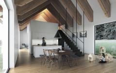The interior of the house is open space that only decoration are the rafters and black metal stairs suspended to the roof structure. Ground floor being the “public” space was strongly exposed into daylight. The windows are located on its own axes to maximize the view potential of the plot, without disturbing the privacy of its inhabitants. Almost every point of the house one can enjoy the views of the mountains.