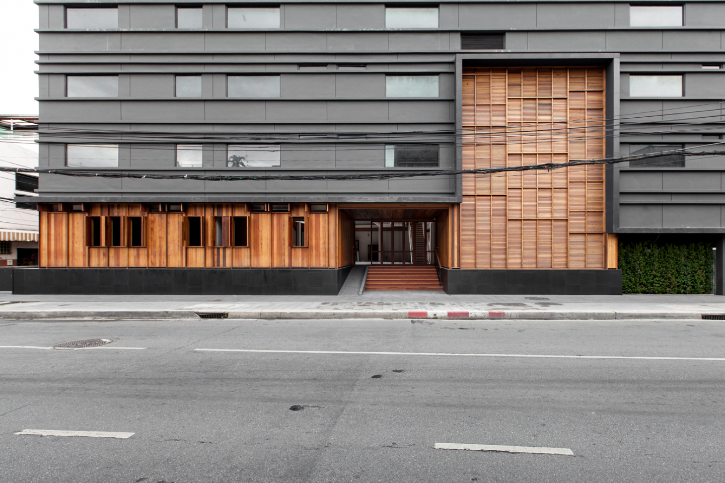 THE OUTER SHELL: On the major street, the dark concrete outer shell, filled with guest rooms, acts as a protective buffer to the labyrinthian open-air courtyard in the center of the building. However, as the building turns the corner into the alley, the building dips down in 4 story scale to accomodate the shophouse neighbors. And finally in the back elevation that directly connects to the shantytown, the building dips down to two storeys to frame a neighbors mango tree garden. THE COURTYARD: In this hidden core, accessed by a wood-lined tunnel from the main street, the remains of the owner’s family100-year-old teak wood house are recombined to create a "scaffolding" for outdoor living. Perched on winding network of open-air stairs, landings, balconies and verandas, guests are visually and physically re-connected to the of the neighboring shantytown in back. (This maze-like courtyard circulation is an extension of the shantytown labyrinthian network of alleys into the vertical dimension). The unique perimeter wall fronting the side alley also allows for hawker food carts to "dock" at the hotel, allowing guests to buy authentic street food and stimulating neighborhood business. CONSTRUCTION AND TECTONICS: The tectonics in the courtyard is ad-hoc, collaged, and hybrid, recombining old wood and new steel. It is a valuable lesson learned from the Shantytown …one of scavenging found objects and improvisation in design. There is no attempt to recreate a nostalgic “Disneyland” historic mansion. Rather, the display of splintered antique wood components encased in a steel armature suggests that these residential components are no longer elements of a house, but rather exhibition artifacts, demonstrating a curatorial attitude towards presenting the historic elements as they truly are… out-of-place and out-of-time. The construction of the outer shell is the most simple concrete frame and plastered brick infill, a system that is easily constructed by local Thai labor. However, the uniqueness of the street facades comes in the most "mundane" construction elements...the drip edge and the control joint. Horizontal drip edges create "speed lines" that accentuate the billboard facade facing the main street. As the building turns the corner into the alley, these protrusions become vertical "koo-haa" (shop house module) division lines, creating a new pedestrian street proportion and rhythm that is more fitting to the neighborhood alley.