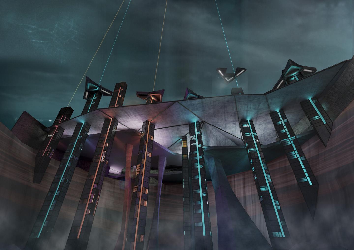 In the Pompeii Airport of 2050, following the ongoing technological development where cell phones are used as boarding passes in todays world, the typical functions of an airport would be intertwined in a way that makes them cheaper, more functional and sustainable. In addition to that, we considered the vertical take-off of the plane where the latter would be comprised as three units travelling as one and separating at a certain part of the journey depending on the different destinations aboard.