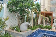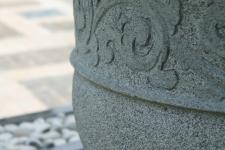 Pots carved from solid blocks of dark grey granite in various heights from 450mm to 2100mm adorn, the entrance, driveway and the water features of this 7-star property. 5 metre high lattice carved in White Sandstone Flanks the Entrance, Exit, Swimming Pool and the Port Cochere creating a stunning visual impact and also screening off the unsightly areas of the site. Light Bollards with Lattice on all sides are placed all over the site.
