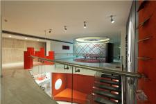 The presentation floor of this media savvy office is endowed with a sense of style and opulence. Four distinct presentation and discussion spaces-two of them complete circles make the space dynamic and dramatic.