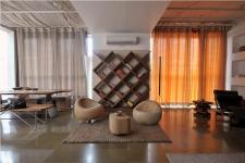 Basic finishes like kota stone, wooden floors and exposed concrete ceilings accentuate the furniture in the house. A few walls are highlighted by attractive wall coverings and lit with focused and directed lighting. Thepure fabrics and soft furnishings bring in a certain informal and comforting feel that complement this neutral yet powerful space, within which contemporary European furniture is tastefully selected and housed.