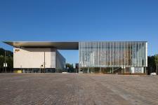 The municipal theater, a blue-ribbon building if ever there was one, stands on the right, encased in a vertically striated glass curtain.