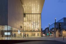 A little withdrawn, the multiplex is fronted by a stone plaza looking towards the cathedral, which is framed perpendicularly between the two facilities. Before and after each live performance or movie, this sheltered space is filled with spectators and pedestrians, milling about in a constant ballet.