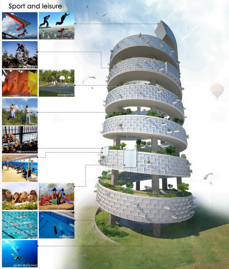 The high-density housing is very actual now. Its more cheaper then medium-density housing and of course then single-family houses. High-rise has small footprint and can be build on a small plot. It is very important in the megalopolises where land is very expensive. But it always involves with some difficulties: Low area of gardening; the lack of infrastructure and leisure facilities; Extreme bicyclists, BACE jumpers, climbers illegally uses different constructions of the building for their own purposes. And when we are talking about block of houses usually apartments on the lower levels have bad views and are poorly lit. Main points of the project are: 1. High-density housing with high percentage of greenery (sq.m per person). 2. Creation of the high-rise community (vertical) 3. Basic infrastructure (kindergarten, laundry and etc.) 4. Legalization of extreme kinds of sport 5. Leisure facilities 6. Promotion of healthy lifestyles 7. Sport facilities The designed building has a shape of helix that allows creating continuous recreation area and alternative way to get to apartments, walking or cycling. Its height is variable from about 45 meters (one turn). There is a well-lit courtyard in the center. The buildings shape and its constructional features also allow to create a large number of types of apartments from very small to very large, one or two-storied and all of them have good views even that overlooks the courtyard. That high-rise dwelling community has a vast recreation area with different sport and leisure facilities; there are kindergarten, laundry, restaurant, club, fitness and etc. in the public blocks, besides they have flat roofs playgrounds there. Staircases can be used as climbing walls. There is a parking in the underground levels. In the court of the house there is a swimming pool with deep zones for diving and scuba diving. Its own elements of the infrastructure make it partially independent. So that community can be placed not only in the megalopolises but in the suburb too in order to save untouched nature landscape around it. So we can say that the designed housing is not just a house but it is a high-rise sport community embodying the ideals of the healthy lifestyle. THE LIFE IS MOTION!