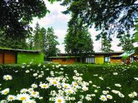 This home and studio was planned as a grand sweeping crescent opening to spectacular vistas over a pebble beach, north across Georgia Strait to the Coast Mountains. Internal spaces flog the ocean shore and open to embrace sun from the north side. Exposed glulam beams curve through space highlighting the circulation gallery and peaking a sense of curiosity as to what lies beyond. The arcs continue outside as a formalized and unifying landscape element between the buildings, gardens, and forest beyond. The interior is composed of a simply expressed post and beam structure with architectural concrete fin walls, hardwood, and bluestone floors and w alonsimple wall planes creating a clean modern space.
