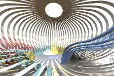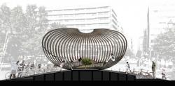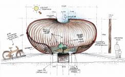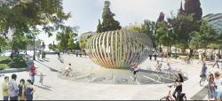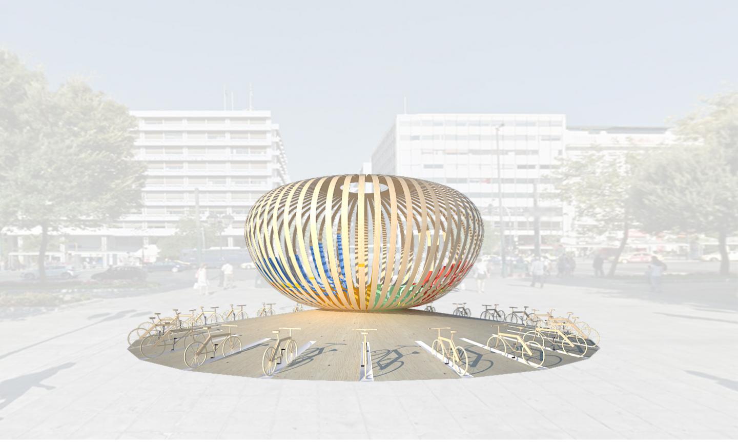 The installation’s design is inspired by traditional Greek handcraft lamps and baskets. The structure will be completely wooden, formed by sixty radial lamellas 200 mm wide and 9,5 m long. Twenty-eight bikes, representing the twenty-eight nations of the EU (European Union), will also surround the central object and will interact with it, creating electricity to illuminate the object at night. Depending on the amount of kilometres completed by citizens per day, the object has the potential to become illuminated in a variety of different forms throughout the course of an evening. More kilometres cycled thus results in a more spectacular lighting performance.